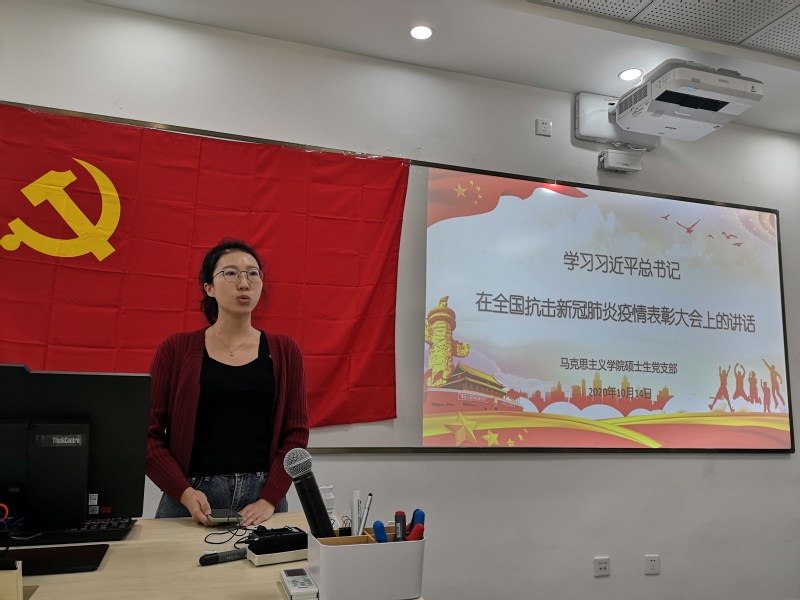 同志们通过联系生活实际及从新闻媒体中了解到的抗击新冠肺炎先进事迹及先进个人,感悟颇深。王天艳同志表示,习近平总书记在讲话中,专门提到了广大90后青年,对自己起了很大的鼓舞作用。王易茗同志表示,习近平总书记的重要讲话,热情讴歌了中国共产党领导和中国特色社会主义制度的显著优势、中国人民和中华民族的伟大力量、中华文明的深厚底蕴、中国负责任大国的自觉担当。侯文君同志表示,参与抗击疫情的党员同志让自己看到了党员的担当和责任感,要向他们看齐。刘文飞同志联系专业知识,表示抗疫精神彰显着人民群众是历史的创造者的深刻真理。其余参会的党员同志们也结合疫情期间自己学习与生活中的感悟做了分享与讨论。