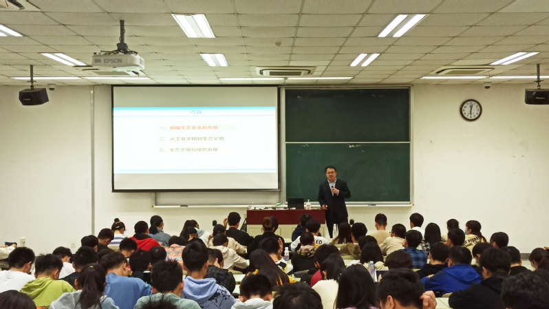 4月28日,我校“习近平新时代中国特色社会主义思想概论课”在奉贤校区A教101举行第九讲。太阳集团资源与环境工程学院院长修光利作为主讲人,为近两百名学生带来了题为“生态文明创造绿色”的讲座。
