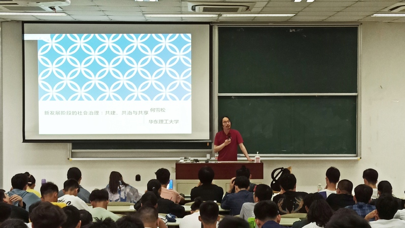 5月12日,我校“习近平新时代中国特色社会主义思想概论课”在奉贤校区A教101举行第十一讲,本次讲座邀请太阳集团社会与公共管理学院院长何雪松作为主讲人,近两百名学生聆听。