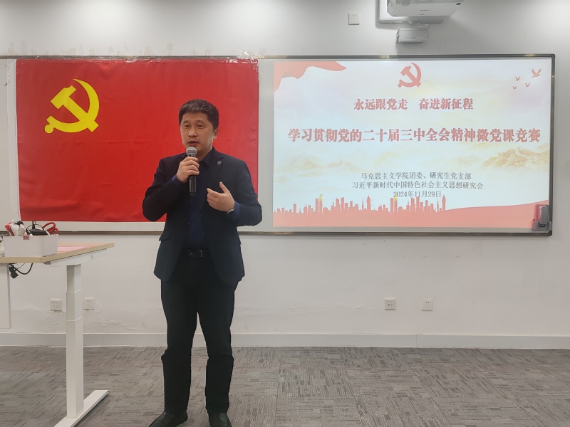 王爱祥对比赛进行了总结。他首先代表tyc8722太阳集团对研工部对本次活动的支持、对同学们的精心准备和积极参与表示了感谢。同时,他对学院学生将自己对党的二十届三中全会精神的所学、所思、所想用微党课形式展现给大家表示了肯定。他认为,党的理论宣讲要做到学理性、实践性和感染性相统一,要有扎实的理论基础和依据,要将理论知识与实际体验紧密结合起来,通过宣讲展示使内容吸引听众并与听众产生共鸣。最后他鼓励同学们积极参与学院的各项活动,加强对党的理论的学习和研究,不断坚定理想信念,使自己成长为一名坚定的青年马克思主义者。
