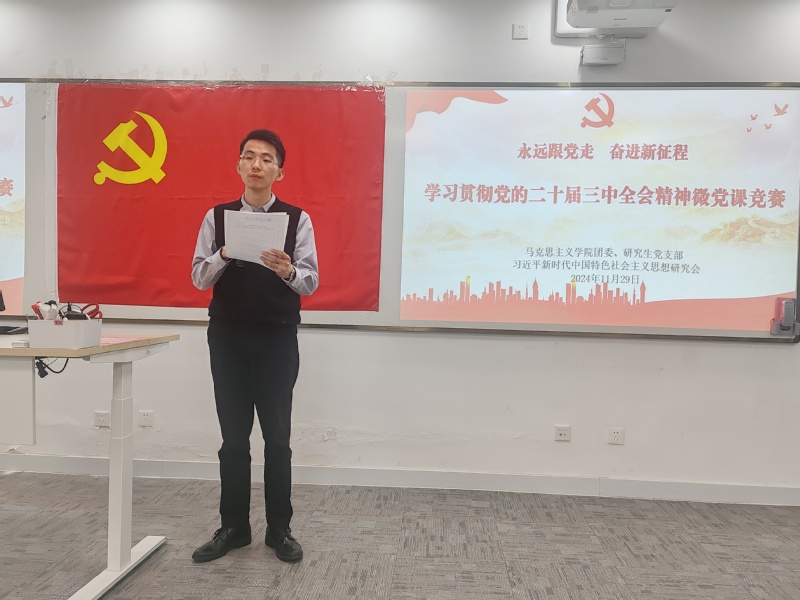 经初次选拔,本次微党课竞赛共11位同学参赛。他们围绕文化自信、中国式现代化、生态文明建设、新质生产力、高水平社会主义市场经济体制等主题,以生动的宣讲展现出他们对党的二十届三中全会精神学习和研究的成果。