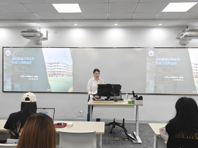 唐亚群老师介绍了上海徐汇区初高中教师招聘的基本条件,如政治标准、身体条件、学历条件、专业要求、普通话要求等,并针对应届毕业生介绍了具体要求。她还详细说明了华理附中完整的学校招聘流程,向大家强调了学校对思政课教师的知识和能力方面要求。