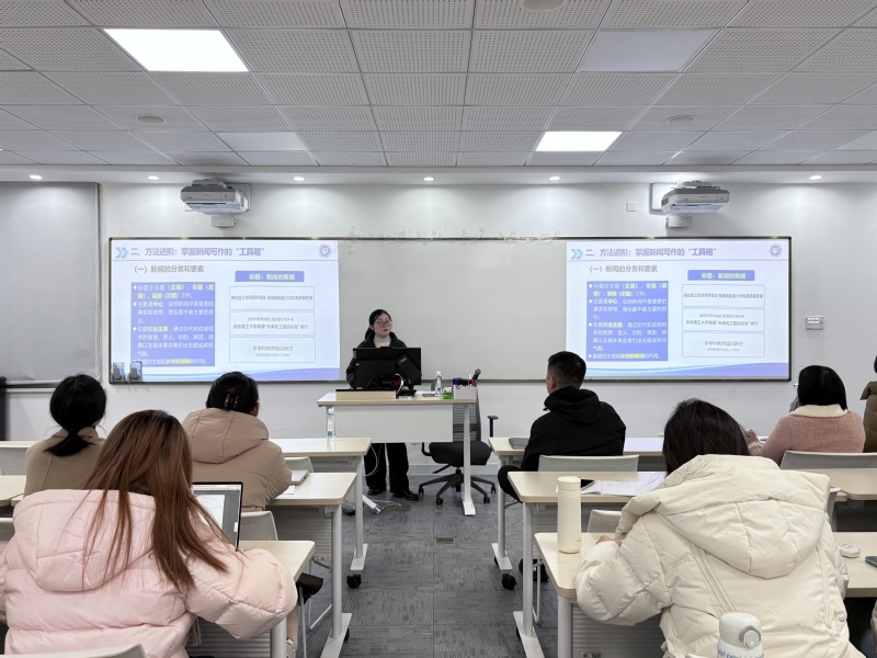 潘聪聪围绕新闻宣传的核心使命与实践方法展开分享。她强调新时代新闻写作需实现从记录者到价值引领者的意识转型,立足意识形态属性,将新闻宣传与学院中心工作深度融合,聚焦教学改革、科研攻关、师生典型等核心选题。针对不同类型新闻,她详细讲解了写作技巧:会议新闻应采用倒金字塔结构,突出领导讲话要点与工作部署;活动新闻需见人见事见细节,多用引语增强现场感;人物通讯要以细节和故事打动读者,挖掘平凡中的闪光点。培训中,潘老师结合校园新闻案例,剖析常见写作错误,提出新闻写作应树立“受众意识”“产品意识”,强调新闻写作需兼顾思想性、可读性与传播性。此外,潘老师还介绍了学校新媒体中心“1+X+Y”运行架构,鼓励师生借助多元平台扩大宣传影响力。